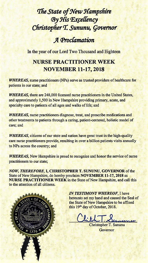 Governor Sununu proclaims November 11 - November 17, 2018, Nurse Practitioner Week