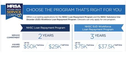 To combat the nation’s opioid crisis, the Substance Use Disorder Workforce Loan Repayment Program (SUD Workforce LRP) offers eligible clinicians up to $75,000 in student loan repayment in exchange for a three-year commitment to provide substance use disorder treatment services at NHSC-approved sites.