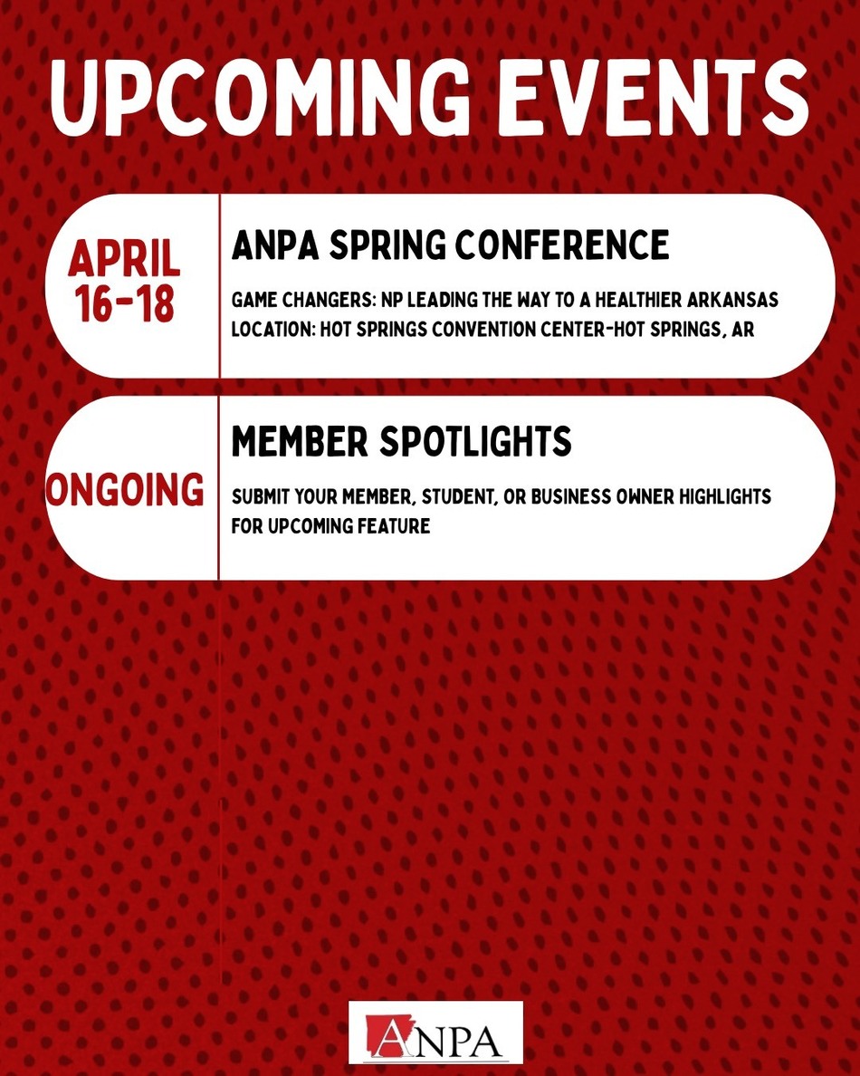 - Conference Registration: https://anpassociation.enpnetwork.com/nurse-practitioner-events/145790-anpa-2026-conference-hot-springs-ar?fbclid=IwY2xjawPaOTZleHRuA2FlbQIxMABicmlkETBzUVlLazNNaDJEMnczOFl1c3J0YwZhcHBfaWQQMjIyMDM5MTc4ODIwMDg5MgABHutQkiGH8ibyeKHvjuufiISC2AFZb4Pdlfoshey_okw1kyxZuWDe0lm2Zw96_aem_IhQi-KPbaJ6K53R1XsQIxQ#!registration
