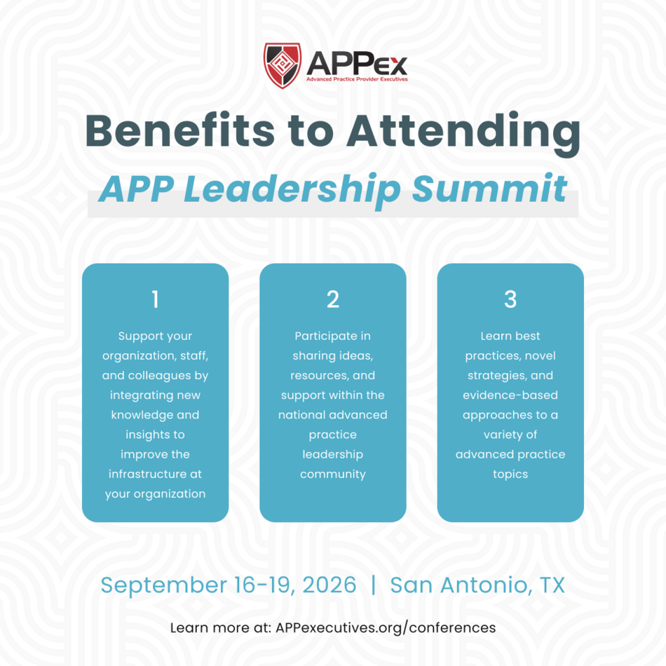APPex’s annual conference held in September--the Advanced Practice Provider (APRN & PA) Leadership Summit--is the first and largest conference specifically geared towards advanced practice leadership and administrative topics.