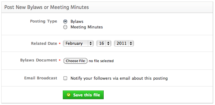 - Use the (choose file) button to locate and upload the meeting minutes or bylaws file from your computer "We recommend PDF's"